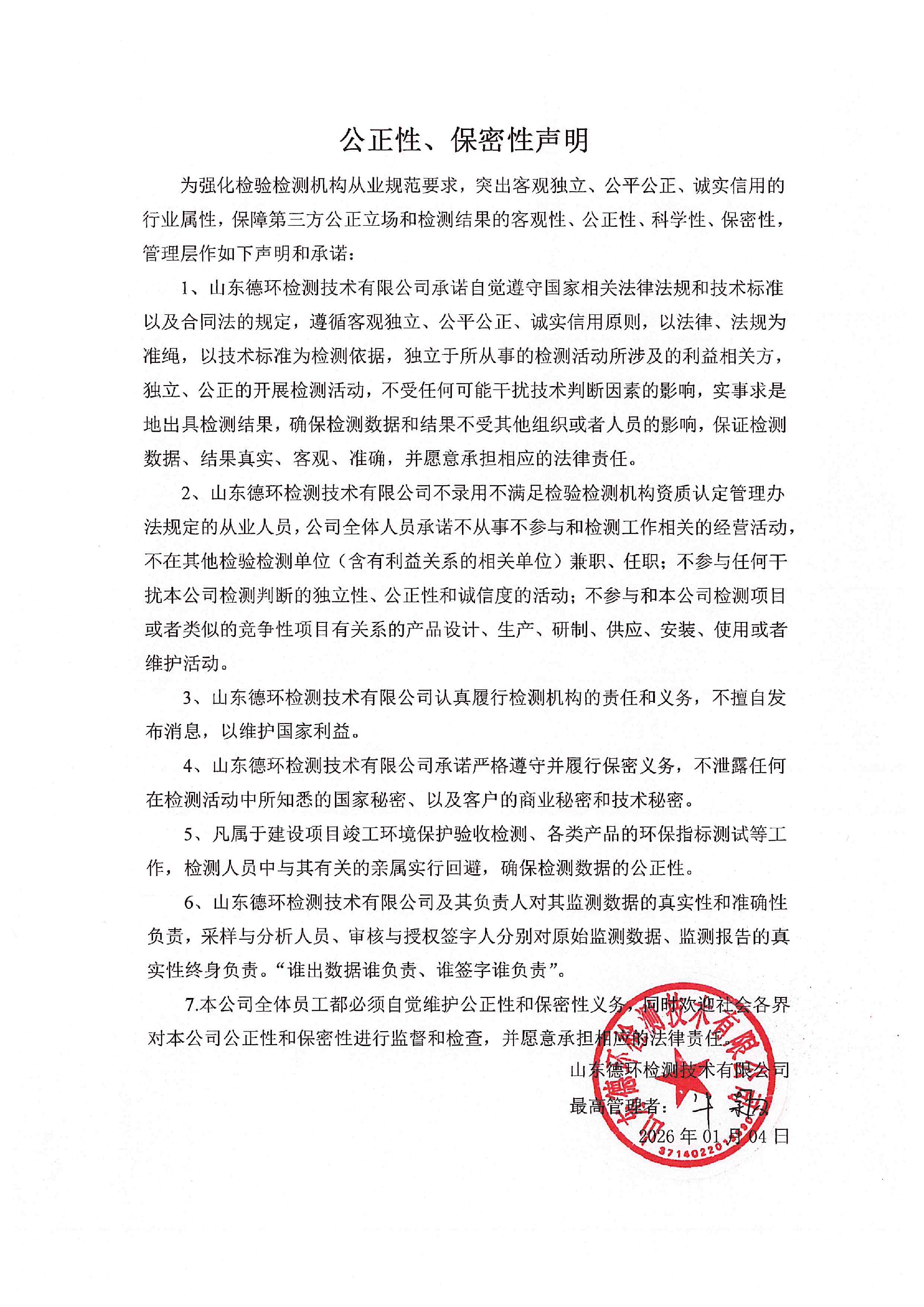為強化檢驗檢測機構從業規范要求,突出客觀獨立、公平公正、誠實信用的行業屬性,保障第三方公正立場和檢測結果的客觀性、公正性、科學性、保密性,管理層作如下聲明和承諾: 1、山東德環檢測技術有限公司承諾自覺遵守國家相關法律法規和技術標準以及合同法的規定,遵循客觀獨立、公平公正、誠實信用原則,以法律、法規為準繩,以技術標準為檢測依據,獨立于所從事的檢測活動所涉及的利益相關方,獨立、公正的開展檢測活動,不受任何可能干擾技術判斷因素的影響,實事求是地出具檢測結果,確保檢測數據和結果不受其他組織或者人員的影響,保證檢測數據、結果真實、客觀、準確,并愿意承擔相應的法律責任。 2、山東德環檢測技術有限公司不錄用不滿足檢驗檢測機構資質認定管理辦法規定的從業人員,公司全體人員承諾不從事不參與和檢測工作相關的經營活動,不在其他檢驗檢測單位(含有利益關系的相關單位)兼職、任職;不參與任何干擾本公司檢測判斷的獨立性、公正性和誠信度的活動;不參與和本公司檢測項目或者類似的競爭性項目有關系的產品設計、生產、研制、供應、安裝、使用或者維護活動。 3、山東德環檢測技術有限公司認真履行檢測機構的責任和義務,不擅自發布消息,以維護國家利益。 4、山東德環檢測技術有限公司承諾嚴格遵守并履行保密義務,不泄露任何在檢測活動中所知悉的國家秘密、以及客戶的商業秘密和技術秘密。 5、凡屬于建設項目竣工環境保護驗收檢測、各類產品的環保指標測試等工作,檢測人員中與其有關的親屬實行回避,確保檢測數據的公正性。 6、山東德環檢測技術有限公司及其負責人對其監測數據的真實性和準確性負責,采樣與分析人員、審核與授權簽字人分別對原始監測數據、監測報告的真實性終身負責。“誰出數據誰負責、誰簽字誰負責”。 7.本公司全體員工都必須自覺維護公正性和保密性義務,同時歡迎社會各界對本公司公正性和保密性進行監督和檢查,并愿意承擔相應的法律責任。 山東德環檢測技術有限公司 2026年01月04日 微信圖片_20260104090332.jpg